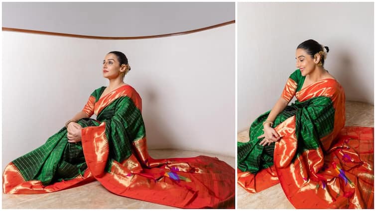 नवरात्रि के पांचवें दिन विद्या बालन ने पहनी हरे-नारंगी रंग की सिल्क साड़ी, देसी लुक से जीता फैंस का दिल