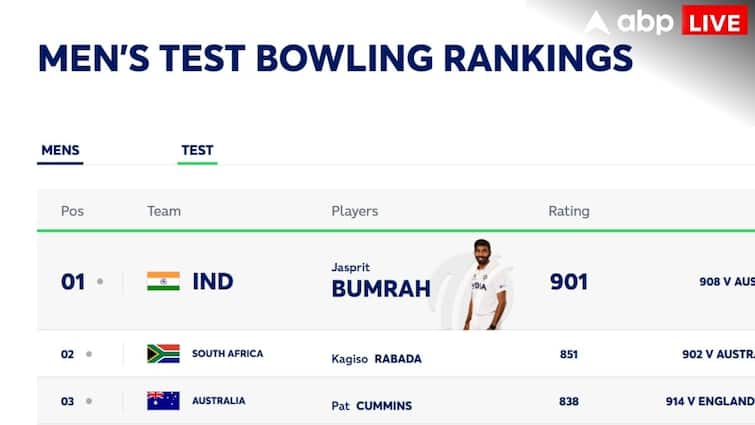 भारत के तेज गेंदबाज जसप्रीत बुमराह इस समय आईसीसी मेंस टेस्ट बॉलिंग रैंकिंग्स में नंबर एक पर हैं. बुमराह के रेटिंग पॉइंट्स 901 हैं. वहीं दूसरे पायदान पर 851 रेटिंग पॉइंट्स के साथ साउथ अफ्रीका के गेंदबाज कागिसो रबाडा हैं. इस लिस्ट में 838 रेटिंग पॉइंट्स के साथ ऑस्ट्रेलिया के खिलाड़ी पैट कमिंस तीसरे नंबर पर हैं. बुमराह, रबाडा और कमिंस को ये रेटिंग उनकी परफॉर्मेंस को देखते हुए दी गई है. वहीं इन तीनों गेंदबाजों ने कई बार अपनी टीमों को मैच जिताने में भी योगदान दिया है.