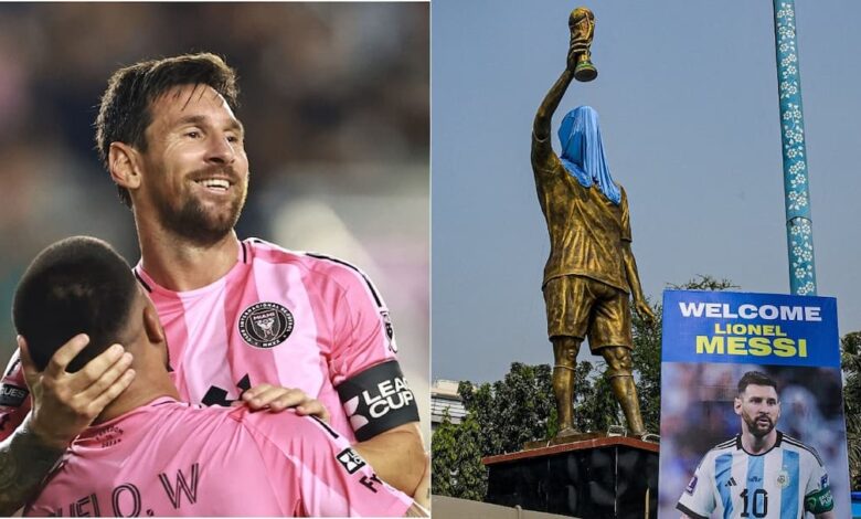 फुटबॉल के दिग्गज खिलाड़ी लियोनेस मेस्सी इस समय भारत दौरे पर हैं. हालांकि, शनिवार सुबह जब यह सुपरस्टार खिलाड़ी कोलकाता के सॉल्ट लेक स्टेडियम पहुंचा तो वहां कुछ ही देर में जश्न मातम में बदल गया. अर्जेंटीना के यह दिग्गज फुटबॉलर 14 साल बाद भारत दौरे पर आया है. मेस्सी के साथ उरुग्वे के लुईस सुआरेज और अर्जेंटीना के मिडफील्डर रोड्रिगो डी पॉल भी हैं. तीनों दिग्गज रात 2:30 बजे कोलकाता एयरपोर्ट पहुंचे. जहां उन्होंने सुबह 11 बजे 70 फीट ऊंचे अपने स्टैच्यू का वर्चुअल उद्घाटन किया. इस दौरान बॉलीवुड एक्टर शाहरुख खान भी शामिल रहे.