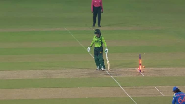 यह घटना पाकिस्तानी पारी के चौथे ओवर की आखिरी गेंद का है. क्रान्ति गौड़ गेंदबाजी कर रही थीं, उनकी गेंद मुनीबा अली के पैड पर लगी इसलिए टीम इंडिया ने LBW की अपील कर दी. अंपायर ने उन्हें नॉट आउट करार दिया, लेकिन इसी बीच मुनीबा अपनी क्रीज से बाहर खड़ी थीं. उनके पैर क्रीज से बाहर ही थे, लेकिन उनसे बैट जमीन पर लैंड करवाने में देरी हो गई.