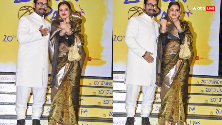 Sitaare Zameen Par Screening rekha poses with aamir khan cover her head with pallu photos viral | Sitaare Zameen Par Screening: सिर पर पल्ला रखकर रेखा ने आमिर खान के साथ दिए कूल पोज, फैंस बोले