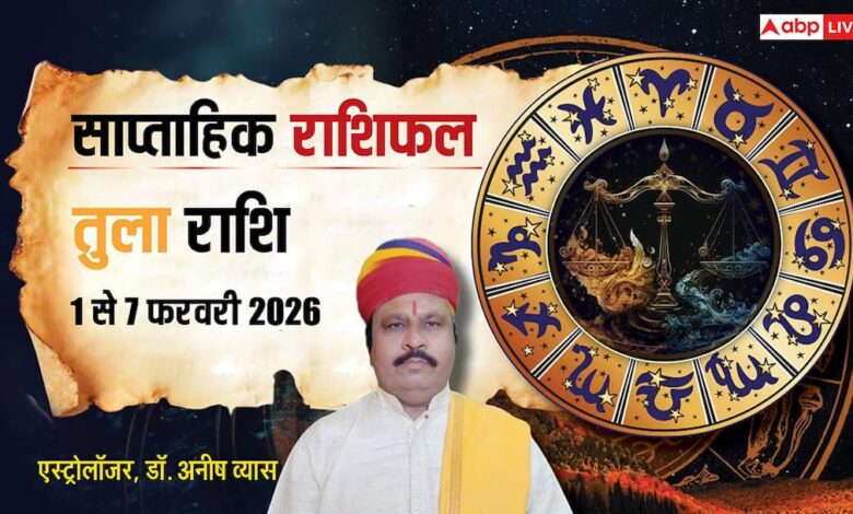 Libra Weekly Horoscope 2026 (1 to 7 February): फरवरी 2026 महीने का पहला सप्ताह 1 से 7 जनवरी का समय तुला राशि के करियर, कारोबार, आर्थिक स्थिति, पारिवारिक व प्रेम जीवन और सेहत आदि के लिए यह सप्ताह कैसा रहेगा. तुला राशि वाले ज्योतिषाचार्य अनीष व्यास से जानें अपना भविष्यफल. यहां पढ़ें पूरा साप्ताहिक राशिफल.